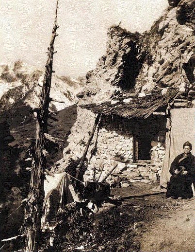Image précédente Image suivante Alexandra David Neel devant son ermitage de Detchen Ashram, 3900m d’altitude – 1914