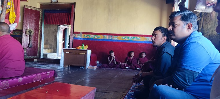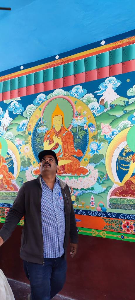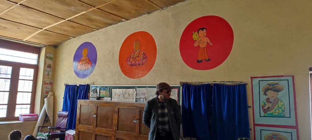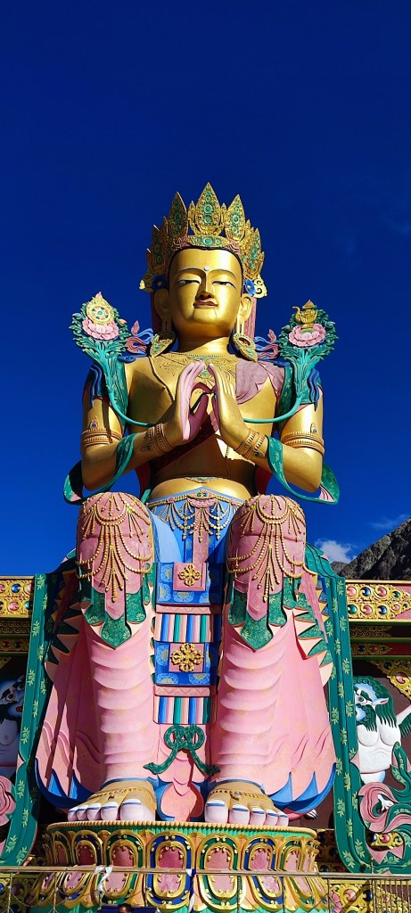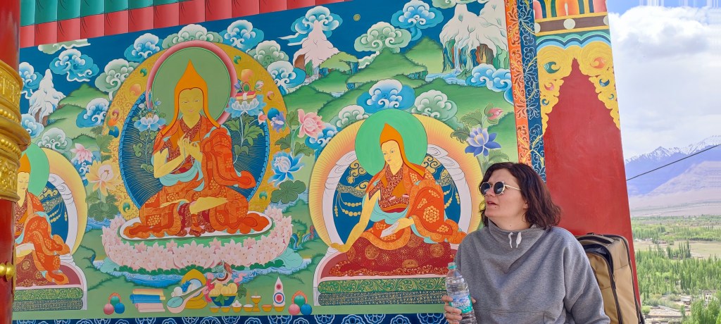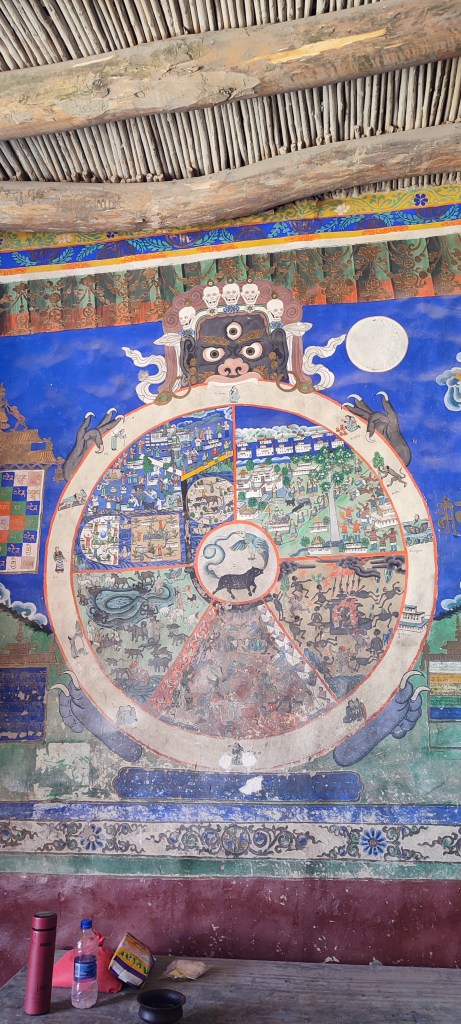 Nous avons ensuite pris le chemin du monastère de Thiksey. Construit au sommet d’une colline rocheuse, cet ensemble monastique ressemble au Potala de la cité interdite de Lhassa au Tibet. Il abrite une immense statue du Bouddha du futur, le Bouddha Maitreya, dont la pureté du regard invite au recueillement intérieur. Yad nous explique qui sont tous ces personnages sur les fresques, chaque Bouddha, et nous décrit la roue du Samsara.