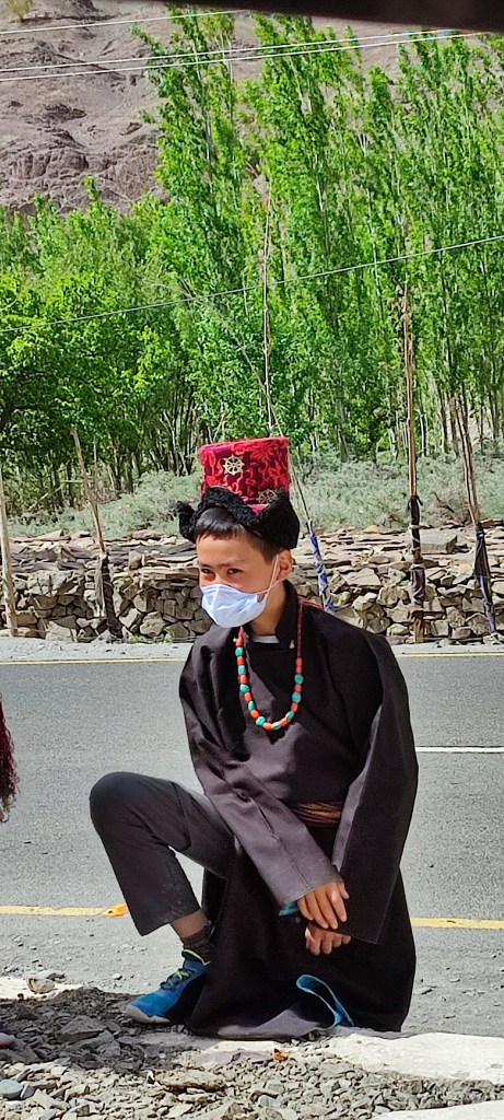 Après un « baby treck » pour certains courageux dans les canyons du Ladakh, nous reprenons la route pour nous rendre chez une famille ladakhie qui va nous apprendre à fabriquer des pates tibétaines et avec qui nous partagerons le repas. Tashi, Sonam et Yad nous montrent et font essayer le Perakh, la coiffe tibétaine. Elle se compose d’une pièce de cuir recouverte d’un tissu rouge sur lequel sont cousues des dizaines de turquoises agencées selon leur taille et leur couleur. Sa forme générale évoque celle du cobra. Les mères la transmettent à leurs filles aînées la veille de leur mariage.