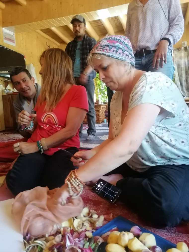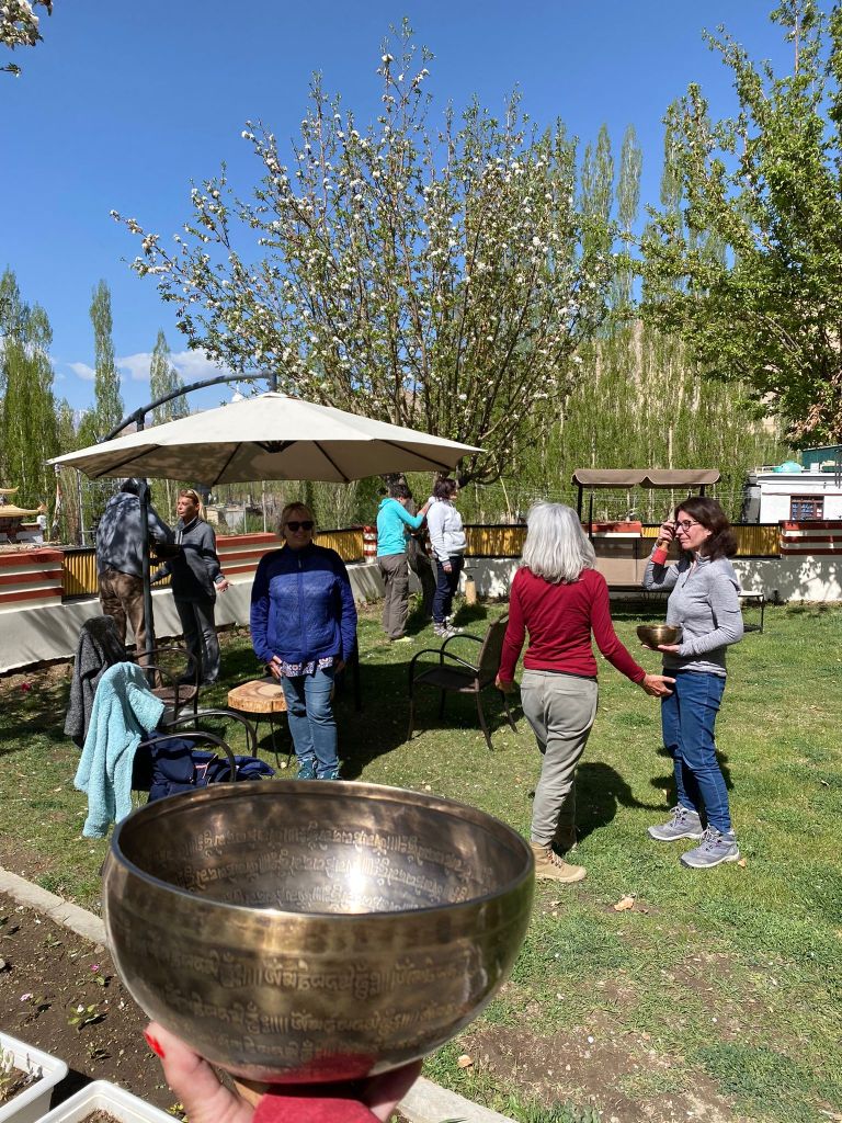 Les premiers ateliers ont lieu sous la tonnelle, un commerçant nous a prêté des Bols chantants afin que je puisse faire découvrir au groupe la magie de leurs vibrations.
