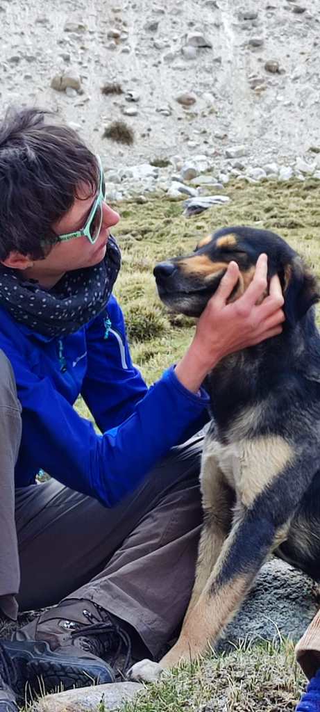 En redescendant, le décor est très changeant : nous arrivons dans un grand canyon désertique entre les montagnes. Nous sommes accompagné(e)s des chiens errants très affectueux et en demande de câlins : ils ont été servis !
