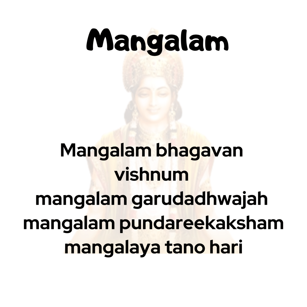Le mantra « Mangalam » est un mantra évoquant Vishnu. Il est chanté dans de nombreux rituels hindous. Il représente la préservation, la continuité, la permanence et la fidélité.