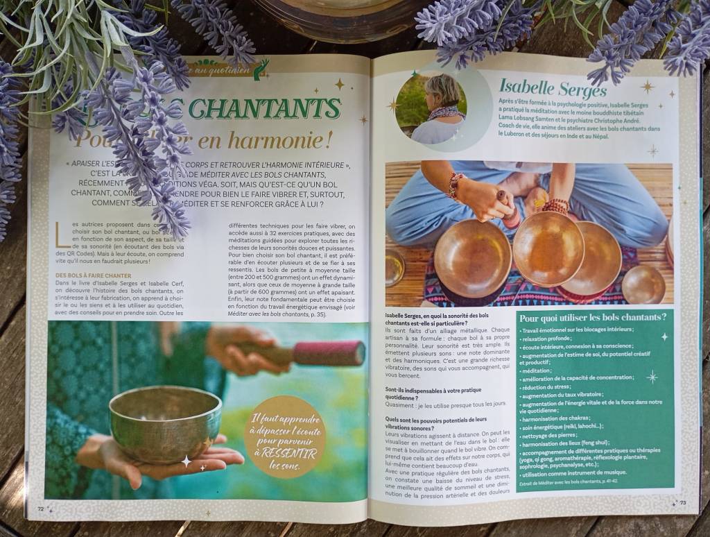 - Mon livre « Méditer avec les bols chantants », co-écrit avec Isabelle Cerf