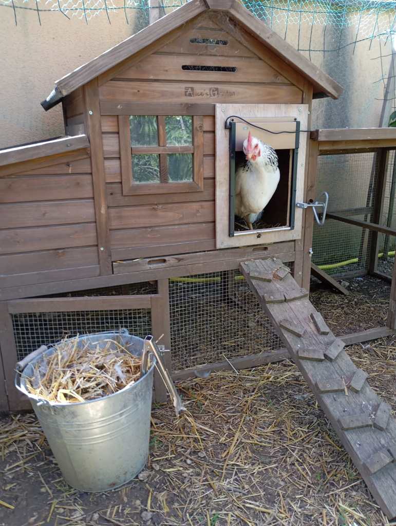 Au dodo ! Nous avons installé une fermeture solaire de la porte du poulailler afin d’être sûres de ne pas oublier la sécurité de nos poulettes dans leur petite maison !