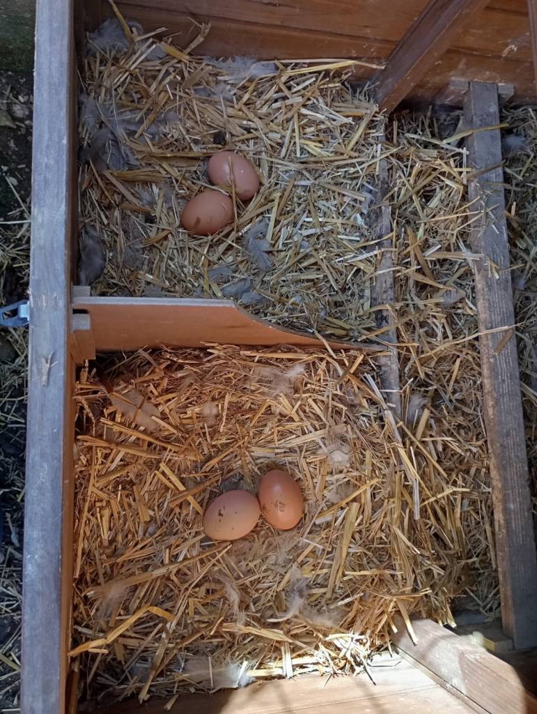 - Un pondoir repéré : nous y avons disposé 2 faux oeufs qui sont à s’y mépandre !