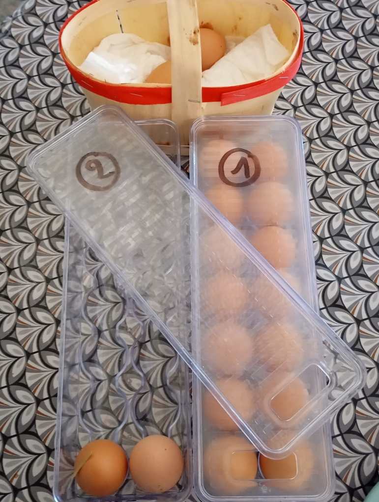 En échange, elles offrent des œufs frais, un vrai plaisir au quotidien. Avec poules, nous assurons au moins 2 oeufs par jour. Nous les rammassons dans un petit panier, le temps qu’ils refroidissent, notons la date dessus au crayon de papier et les rangeons ensuite dans 2 boites de 14 emplacements. Nous les rangeons au réfrigérateur, même si nous savons que cela n’est pas utile… Ca nous rassure !