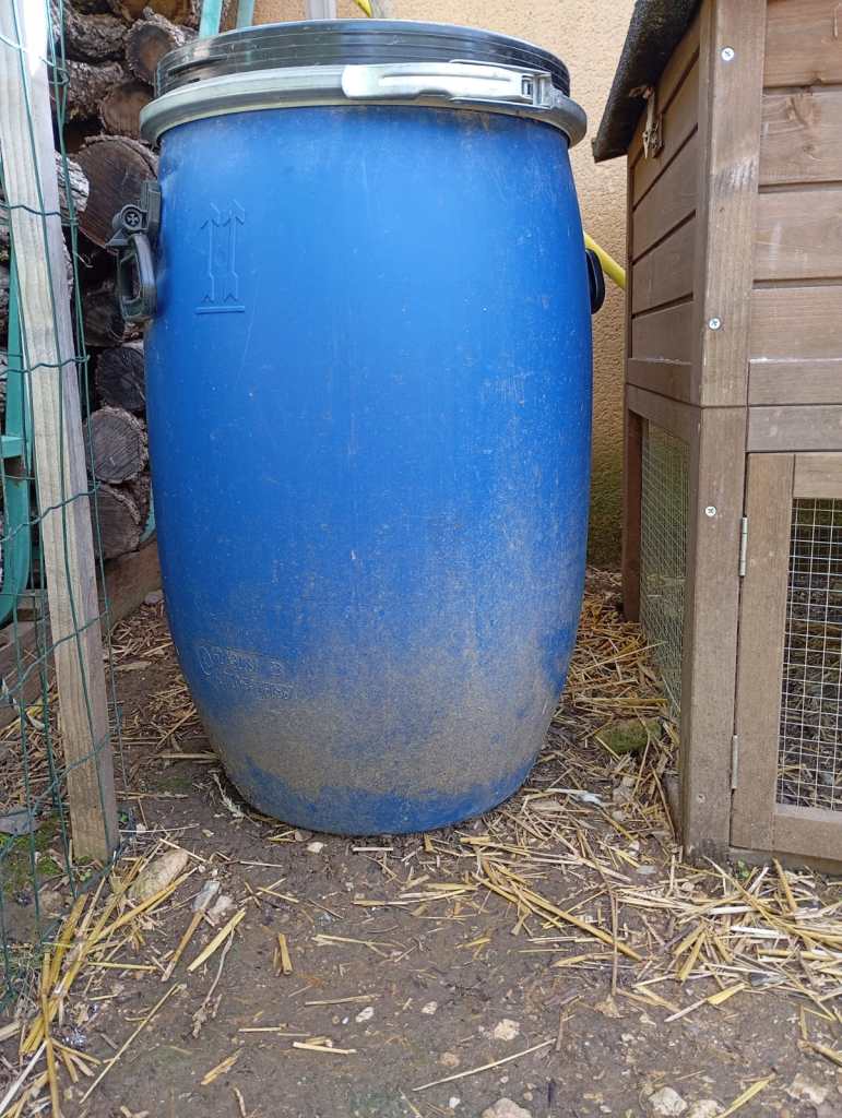 Nous rangeons le grain dans un bidon de 60l, qui est parfaitement protégé des intemperiEs alors que nous le laissons dehors, à côté du poulailler.