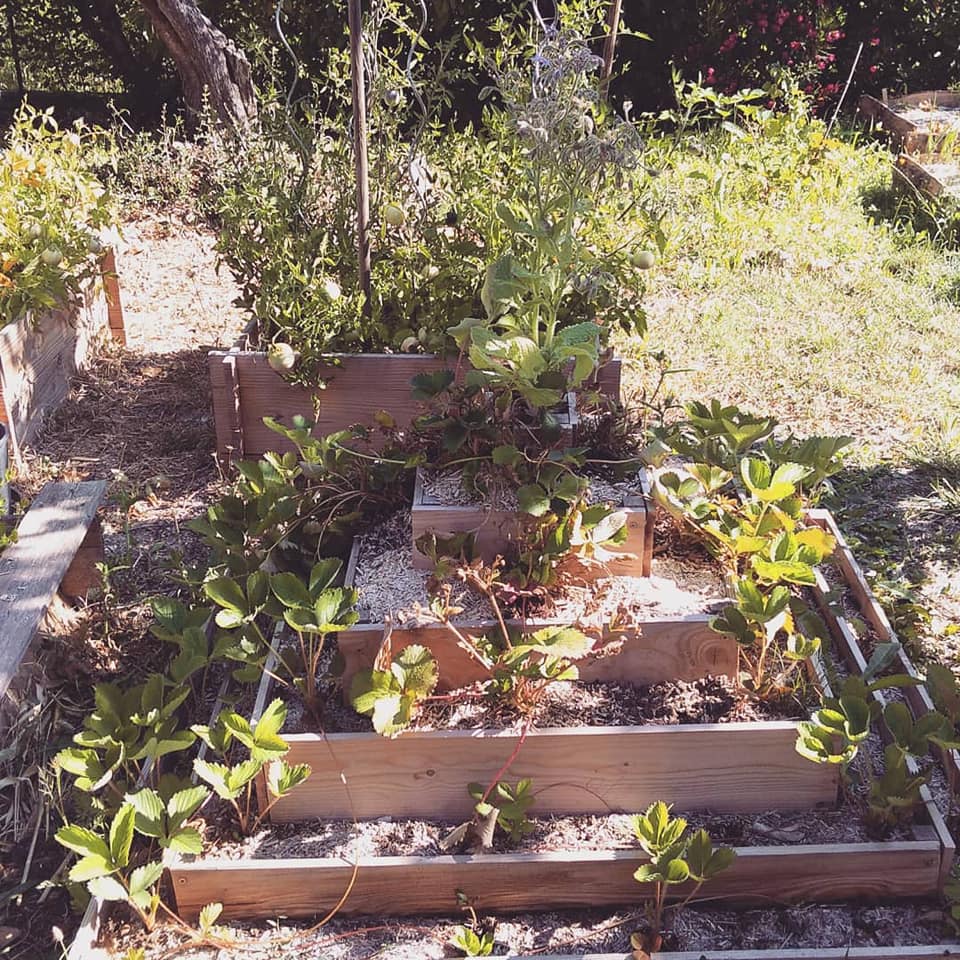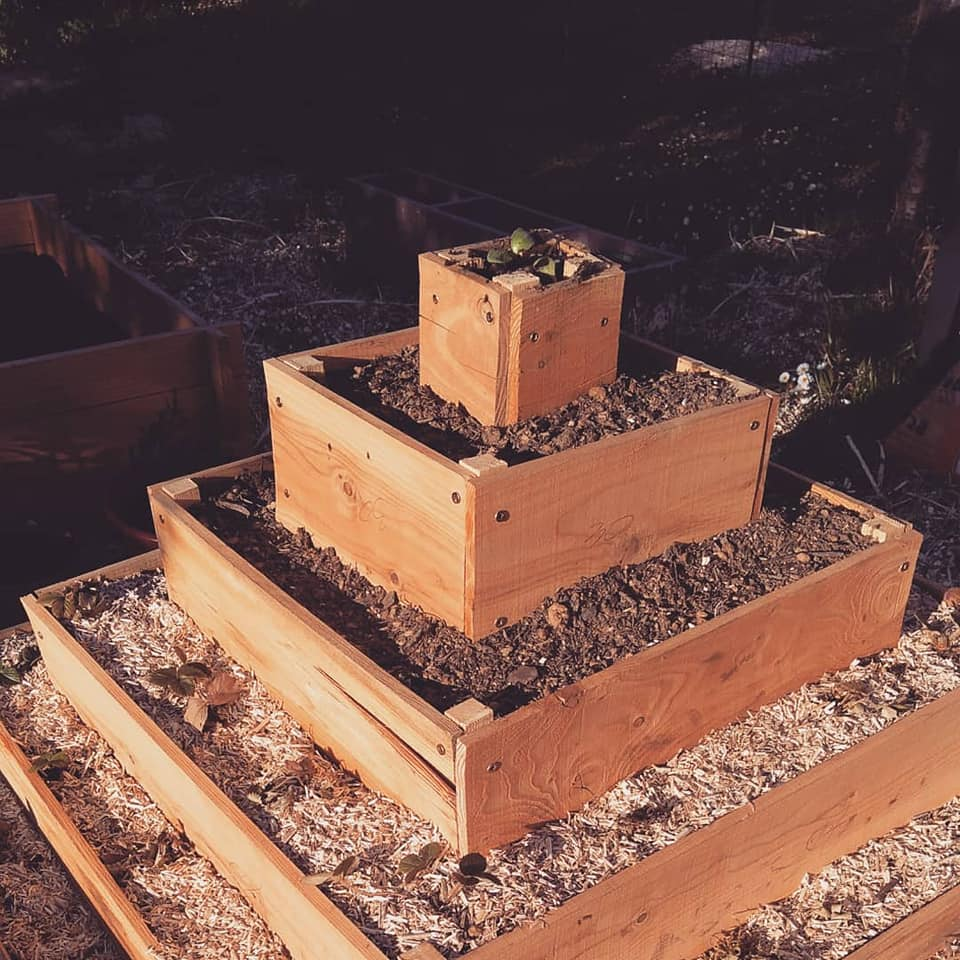 Nous avons également fabriqué une pyramide pour fraisiers : c’est magique de mettre autant de plants sur si peu de surface !