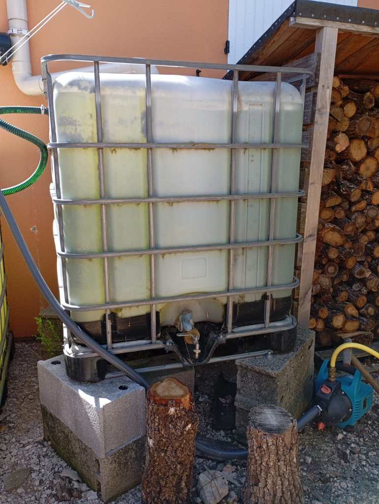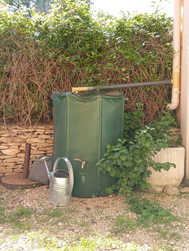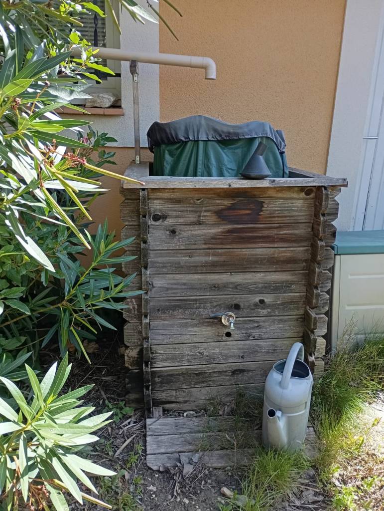 Bien entendu, nous avons aussi mis 2 autres récupérateurs sur le terrain : un à l’entrée de la maison et un vers la tonnelle pour arroser les autres plantes.